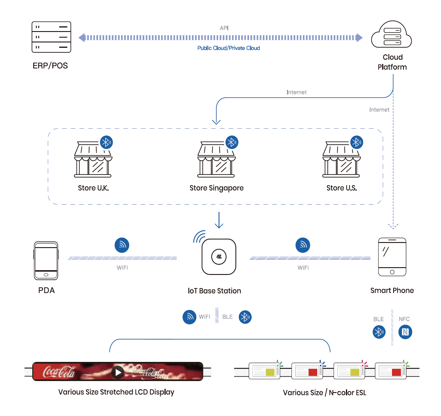 Etiketlerin güncellenmesi için gereken iletişim, yüksek verimli baz istasyonlarımız aracılığıyla sağlanır. İşletmenizdeki standart LAN (Yerel Ağ) hattına bağlanan baz istasyonu, basit bir kurulumun ardından tüm sistemi yönetmeye başlar.